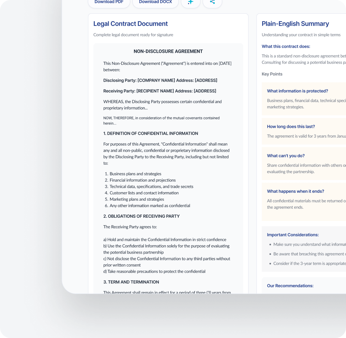 See your contract instantly in a split view. Full legal document on one side. Simple explanation on the other.