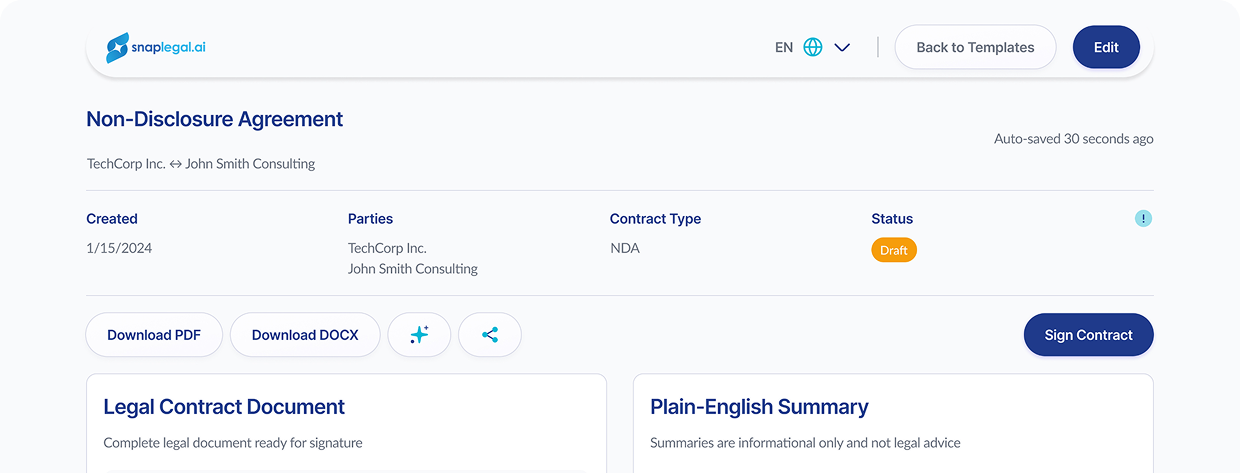 Create legal contracts in minutes with guided steps and plain-English summaries.